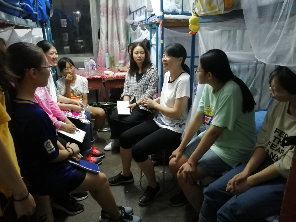 的新生宿舍里气氛热闹,欢快温馨,首次“我的大学教授”宿舍第一课活动正在热烈开展。包颖教授、候元同教授、王仁君教授、邱念伟教授走进新生宿舍,走访慰问2019级新生。