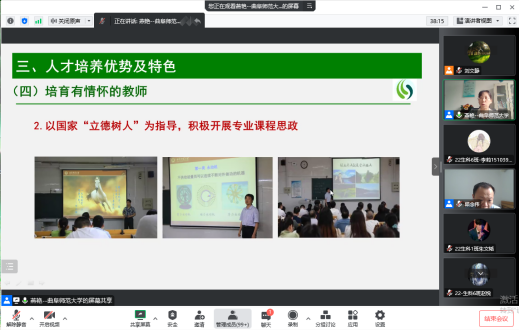 会前,与会人员一起观看了基于OBE理念的生物科学(师范)专业人才培养体系的改革与研究宣传片,了解了学院生物科学专业培养体系。随后,燕艳老师围绕厚基础、强能力、有情怀等人才培养目标的几个方面介绍了学院对于师范生培养的整体情况,全方位展示了师范生育人成效和就业发展前景。报告中,燕老师结合学院日常开展的教育教学活动,让同学们提前感知学院鲜明的教师教育特色,为成为优秀生物教育人才做好充足准备。