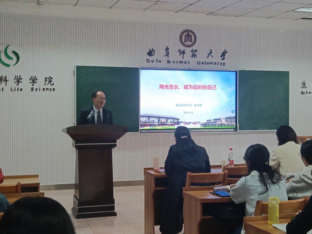 为厚植新时代教育情怀,培养综合素养高、育人能力强的卓越中学生物学教师,10月18日下午,学院举办庆祝建校七十周年“弦歌七秩 ‘质’敬教育”教学质量提升行动系列报告暨“卓越教师—启润讲堂”第九讲报告会。报告会邀请东营市教育科学研究院正高级教师、山东省特级教师杨守菊,青岛实验高中校长姜文新作专题报告。25级学科教学(生物)全体研究生及部分生物科学(师范)专业本科生参加了报告会。报告会由副院长燕艳主持。