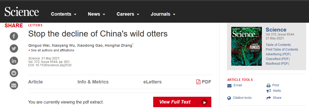 “Stop the decline of China's wild otters”一文于5月21日在Science(科学)杂志发表, 张洪海为通讯作者,其团队成员、足球比分手机版