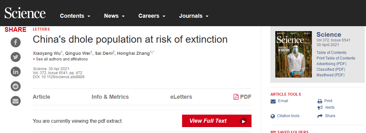 “China's dhole population at risk of extinction”一文于4月30日在Science(科学)杂志发表,曲阜师范大学为通讯作者单位,张洪海为通讯作者,其团队成员、生态学全职博士后吴晓阳为第一作者。张洪海课题组与青海巴特野外工作室进行合作研究,在格尔木地区发现了近十年来最大的豺群。豺对维持生态系统结构和功能的完整性具有重要作用,但是多年以来对该物种的保护或科学研究极少。2月5日,我国政府将国家重点保护野生动物名录中的豺由二级保护提升为一级保护。作者呼吁全世界人们必须提高对豺的保护意识,阻止人类在冲突或狩猎时破坏它们的栖息地甚至捕杀它们,同时各国政府必须立即实施最严格的野生动物控制措施以保护这些濒临灭绝的物种。