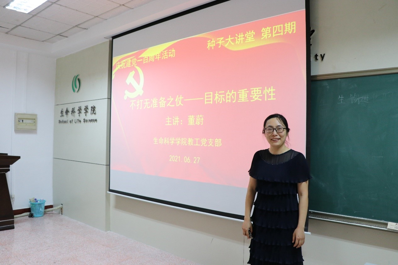2021年6月28日上午,在生科院二楼多媒体,由教工党支部举办的特色活动-“种子大讲堂”第四期顺利开展。本期主讲人董蔚副教授以“不打无准备之仗——目标的重要性”为题为学生入党积极分子带来了一场精彩的讲座。