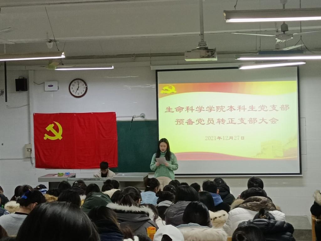 本科生党支部预备党员转正支部大会于生物楼128室召开。会议由党支部书记杨申振主持,本科生党支部党员参加此次会议。
