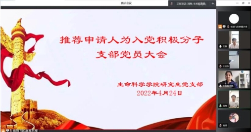 研究生党支部于2022年4月24日下午召开线上支部大会讨论推荐申请人为入党积极分子。会议由党支部书记燕艳同志主持,全体研究生党员参加。