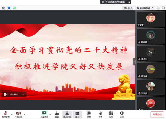 李志广强调,一要坚持把学习宣传贯彻党的二十大精神,作为当前和今后一个时期的首要政治任务。要原原本本学习研读党的二十大报告和党章,认真领悟党的二十大提出的新思想新论断、作出的新部署新要求,推进习近平新时代中国特色社会主义思想入脑入心,真正做到内化于心,外化于行。二要深刻领悟“两个确立”的决定性意义,加深对习近平新时代中国特色社会主义思想、马克思主义中国化时代化、中国式现代化等重大问题的认识,真正做到增强“四个意识”、坚定“四个自信”、做到“两个维护”,切实把思想和行动统一到党中央精神上来。三要坚持学以致用,把党的二十大精神转化为推动学校学院高质量发展的实际行动,切实确保中央、省委、学校党委各项工作部署落到实处、见到实效,以实际行动践行习近平生态文明思想,围绕国家战略进行有组织的科研,真正做到追求卓越、奋争一流,推进学院事业取得新突破。四要将学习党的二十大精神,学习学校第九次党代会精神转化为工作动力,抓住机遇,迎接挑战,铆足干劲,踔厉奋发,勇毅前行,不辱使命,让学院更好更快地发展,将学院工作推向更新更强台阶!