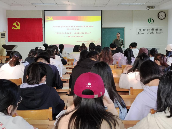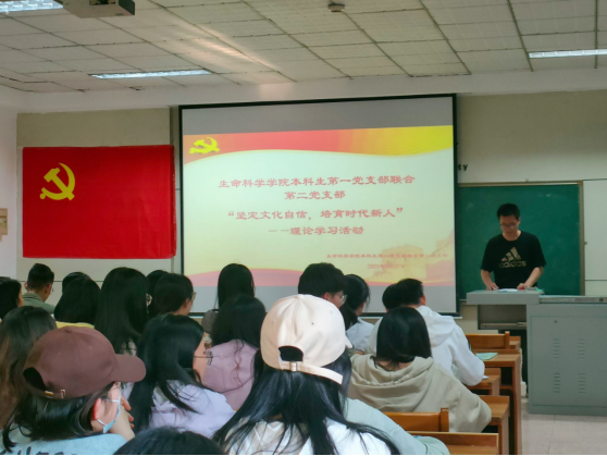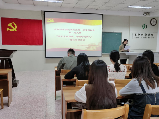 本科生第一党支部联合第二党支部于生物楼232室召开“坚定文化自信,培育时代新人”理论学习活动。本次活动由本科生第二党支部书记赵连栋同志主持。