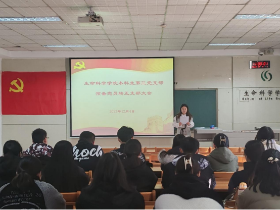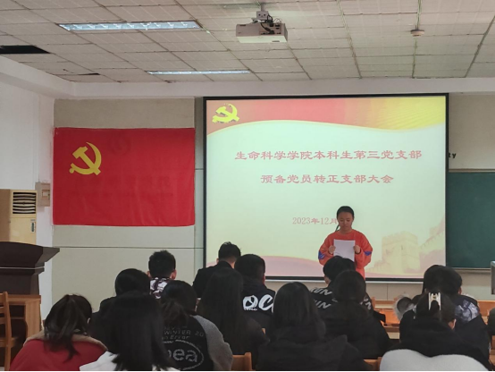 本科生第三党支部于生物楼232室召开预备党员转正支部大会。本次会议由第三党支部书记袁晓涵同志主持。