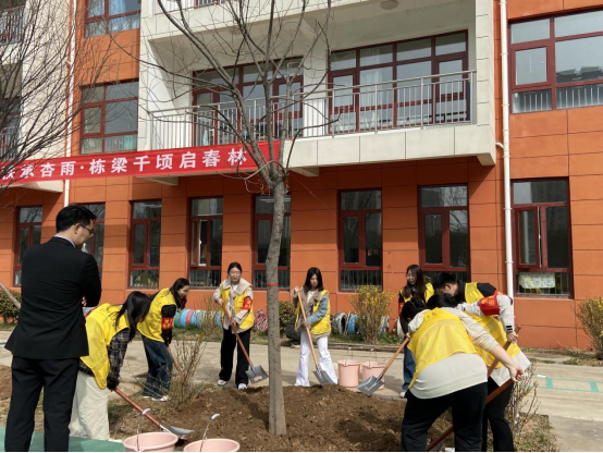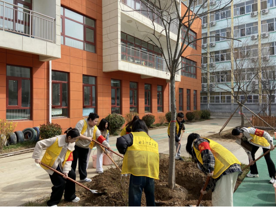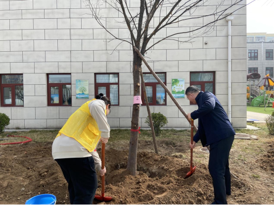 在植树活动开始之前,支部党员们共同学习了习近平总书记对深入开展学雷锋活动作出的重要指示。随后,支部党员们各司其职,协同配合,挖掘树坑、稳固树苗、填土夯实、灌溉浇水,共同参与到植树行动中。在这次活动中,支部党员们不仅为幼儿园增添了一道绿色的风景线,也为幼儿园的小朋友们树立了“学雷锋”的好榜样。