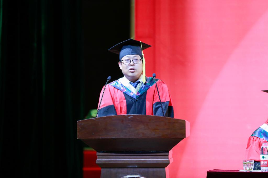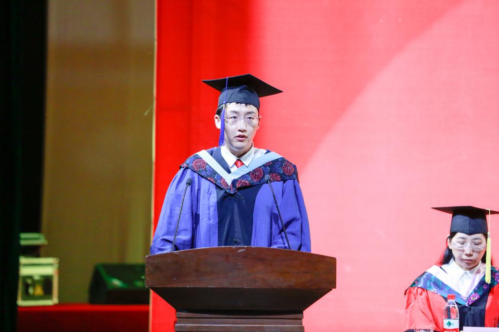 研究生毕业生代表商永泉同学代表全体毕业生表达了对母校、对学院、对各位恩师的感激之情。他表示,七载求学时光,自己已逐步成长为思想独立、学识广阔、笃行思辨的“曲园人”。他说:“我们就要迎来庆祝中国共产党成立100周年的光荣时刻,在两个一百年交汇的伟大时代,我们更要坚定信心,主动作为,真正发挥好在各行各业生力军和突击队的作用,不负重托、不辱使命,交出无愧于祖国和人民的青春答卷。”