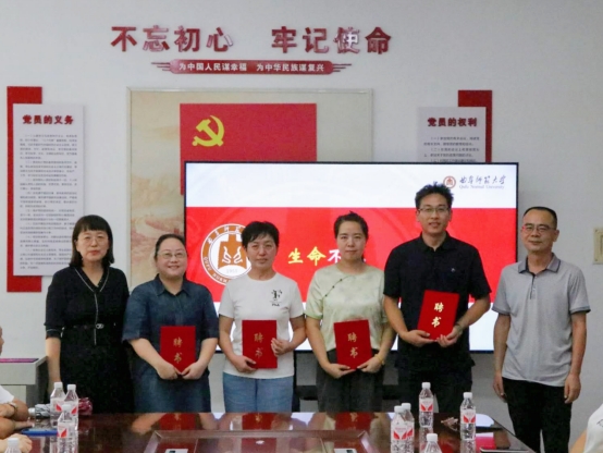 李志广、王仁君为家委会主任、副主任、秘书长颁发聘书并合影留念。受聘仪式后,新当选的家委会主任胡超群作了发言,感谢学院和各位家长的信任,表示将以身作则、加强沟通,与全体家长一起携手并肩,积极支持和配合学院的工作,助力学生成长成才。