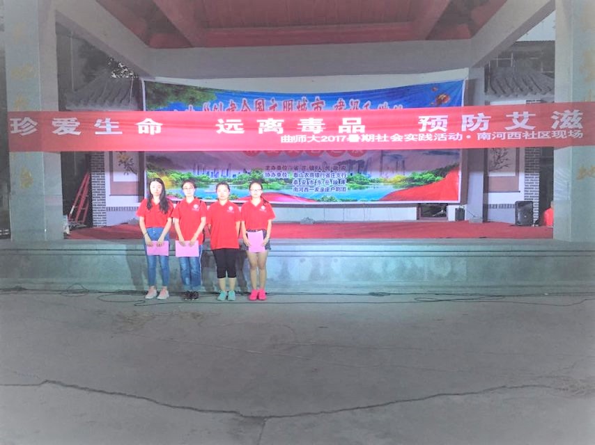 在重要的宣传环节中,本次社会实践活动选择了两个地方作为宣传的主要地点,分别是南河西社区和医院。并为这次宣传影印了宣传纸,展板,在农村搭建舞台进行呼吁宣传。为深入禁毒防艾学习,同学们来到缉毒大队进行参观,并与领导深入交流泰安市的吸毒人员情况以及平时的打击宣传工作,了解了缉毒工作人员的工作性质,令同学们获益匪浅。其次,团队来到泰安市疾病防御控制中心,泰安市疾病防控中心一直是泰安市疫情的监控和处理突发状况的重要机构,本次实践在此进行了挂牌,并派代表与党委书记兼主任杨女士进行亲切交谈,了解关于艾滋病的宣传活动,参观了艾滋病咨询室,对艾滋病患者的恐惧有了深入了解,此处作为曲阜师范大学的社会实践基地,相信以后双方会有更加深入且友好的合作。
