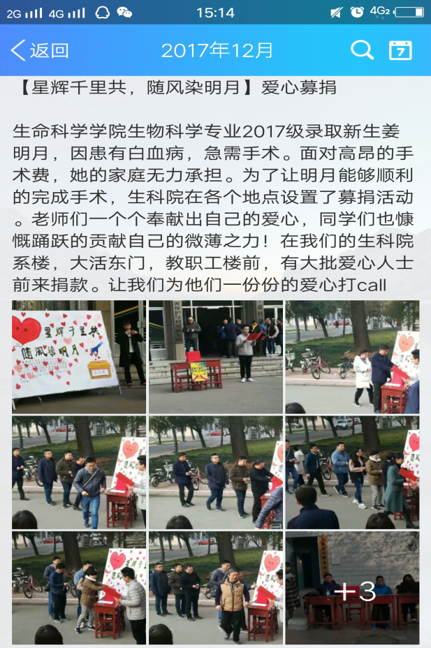 分工会以及团委学生会发起了全校范围内的募捐活动,积极呼吁全校老师和同学们献出一份爱心,募捐活动于早上8点半正式开始,院党委书记,院长,党委副书记,办公室主任等院系领导率先捐款,随后老师们依序捐款,拉开了爱心募捐活动的序幕。整个募捐活动持续了一天,学生干部们一直守在募捐点,尽管寒风凛冽,但是随着爱心人士们一个一个地募捐,让大家都觉得寒风不再,爱心温暖了整个冬日。同时,姜明月所在班级也行动起来,老师们和同学们为她录制祝福视频,为她写祝福语为她祈福。