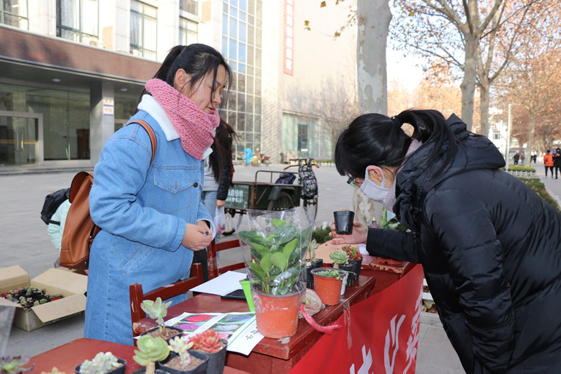 于大学生活动中心前举行“绿植花卉生物特色产品”义卖活动。以让人容易接受的义卖形式使同学们亲身体验职场情境,锻炼了同学们的反应、表达和人际交往能力。