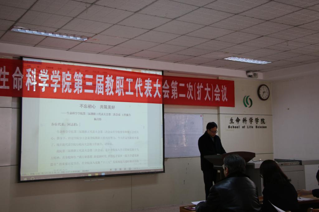 学院院长杨月伟同志向大会作了题为“不忘初心 共筑美好”的工作报告。报告总结了学院一年来所取得的优异成绩,尤其是生态学一级学科博士点的成功申报,同时也客观地分析了学院在发展过程中存在的主要问题,明确提出了今后两年的总目标:全面落实立德树人、培养创新人才的要求,积极推进本科生、研究生的理论教学、实践教学及科技创新等活动,加强科研及重点建设的工作等。
