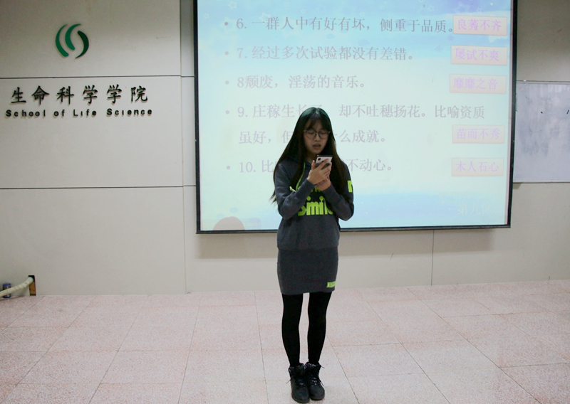 活动伊始,由主持人讲解比赛流程及比赛规则,并宣布比赛开始。各组参赛人员先做了简单的自我介绍并展示了自己的才艺。第一环节为心有灵犀一点通,各参赛人员根据PPT上的成语解释猜成语,各选手都绞尽脑汁的回想以前的记忆。第二环节为我辈岂是蓬蒿人,各组派一名选手记忆词语,并在三分钟内把记住的默写下来,每个人都在努力记忆,默写时也在争分夺秒奋笔疾书。最后一个环节为百二秦关终属楚,这个环节的分值最大,各参赛选手都以非常严谨的态度做题,对于答对的选手观众们用掌声来为他们庆祝。最后是观众的表演,他们上场成语接龙,最后获胜的观众会获得精美礼品。