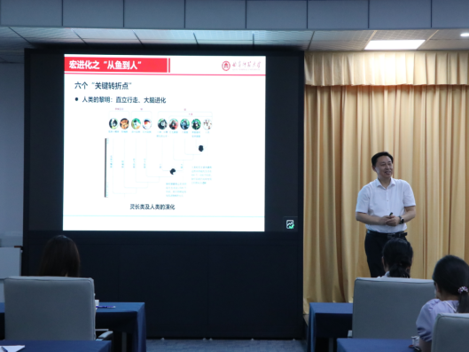 课程以达尔文雀、长颈鹿适应性演化等经典案讲授生物演化理论,揭示了“生命与环境协同进化”的科学规律,深入浅出地阐述了“人与自然和谐共生”的生态哲学。他指出,要从生物演化中汲取成长智慧,把适应变革的生存法则转化为创新突破的科研能力,把和谐共生的生态理念升华为科技向善的价值追求。