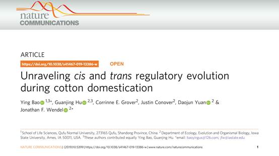 包颖教授在国际顶级期刊Nature Communications上发表了题为“Unraveling cis and trans regulatory evolution during cotton domestication(揭示棉花驯化中的顺反调控进化)”的学术论文,曲阜师范大学为论文的第一署名单位和第一通讯署名单位。这是包颖教授继以我校为第一署名单位在PNAS上发表文章之后,于棉花驯化研究领域取得的又一次突破性成果。