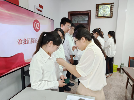 团委书记刘文静宣读了新发展团员名单,为新团员颁发团员证、佩戴团徽。
