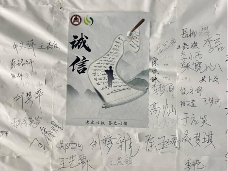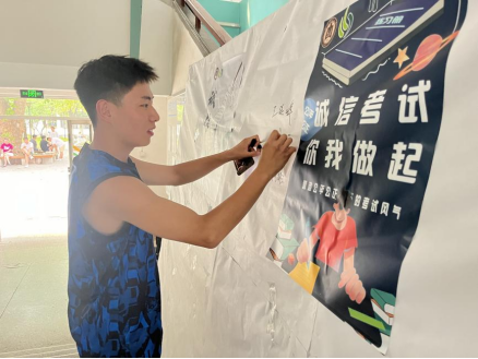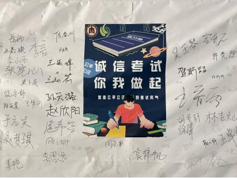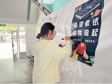 团委、学生会设计宣传展板,张贴诚信应考的宣传海报,营造了诚信应考的考试氛围。