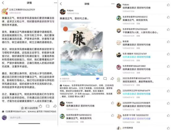 2022级和2023级各班分别进行了有关廉洁文化的特色活动。2022级各班展开了新闻“廉”播、标语接龙和绘制清廉作品活动。在新闻“廉”播活动中,班级同学积极搜集廉洁故事并上台分享,通过讲好廉洁故事来弘扬廉洁精神;在标语接龙活动中,班级同学在QQ空间或微信朋友圈以“秉廉洁正气 树优良学风”为主题发表感悟并转发与留言评论,表达自己对廉洁的看法与理解,为廉洁精神点赞,在网络上掀起一场歌颂清廉精神的浪潮;在绘制清廉作品活动中,班级同学结合自己对“廉洁”的理解,运用画笔制作廉洁宣传作品,描绘出自己心中的廉洁之风,优秀作品在生物楼一楼大厅展示,让廉洁文化润泽大家的心田。