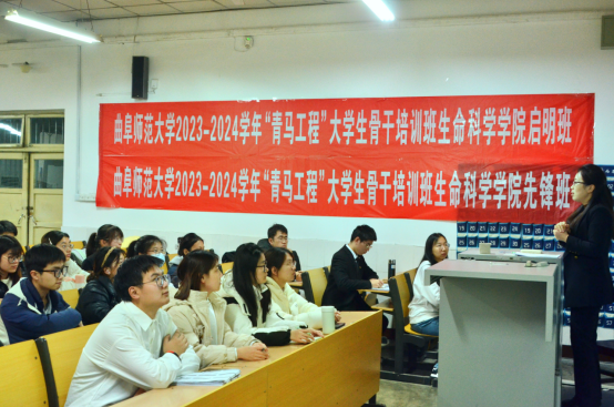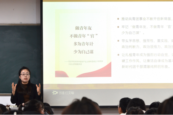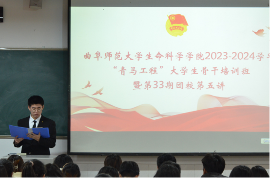 “青马工程”大学生骨干培训班第五讲于生物楼332教室开讲,学院团委书记刘文静为“青马工程”大学生骨干培训班全体学员授课。