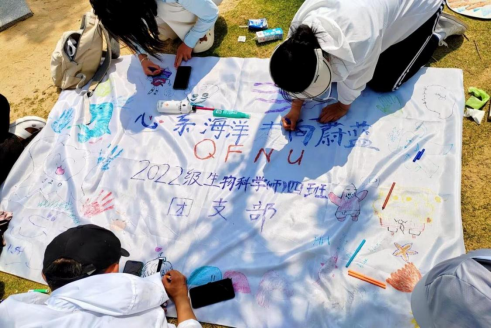 在专业实习实践结束之后,团支部开展了“心系海洋,走向蔚蓝”绘画活动。同学们满怀着保护海洋生态、建设健康海洋的信念,以水彩绘青春,以画笔描未来,在纯白色的画布上绘下生动有趣的海洋动物和卡通人物。同学们相互合作,在彼此的画布上用掌印镌刻誓言,用颜料书写祝福,既丰富了活动的层次内涵,又促进了团支部成员的感情联络。