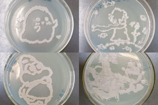 活动伊始,由主持人介绍了举办本次活动的目的以及活动的主要流程。随后实验室的指导老师为我们介绍了实验所用到的菌落以及培养基,讲解了制作平板的具体步骤以及注意事项。紧接着,参赛成员们以小组的形式进行比赛,每班一组,每组2到3人,由一名队长带队。各小组使用灭菌棉棒和牙签分别地蘸取不同菌液,然后在酒精灯旁操作以确保无菌环境,每组根据自己的创意和计划进行绘画创作,制作完成后标记好小组信息,由指导老师将平板放入培养箱中培养,一段时间后观察平板形态并拍照记录,将参赛作品统一拍照并上传至队长交流群,最后由我部人员及各队队长对作品进行投票评选,选出优秀作品。经过投票,选出马源组同学荣获一等奖,郗鸿原和孙文哲组同学荣获二等奖,段亚萱、董文睿和徐雯晴组同学荣获三等奖。