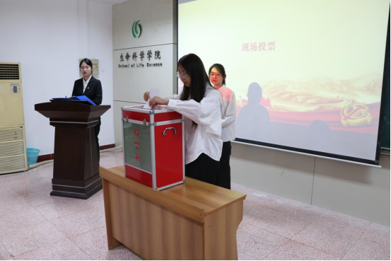 随后,各候选人依次上台进行竞职演讲,各学生代表进行现场投票。为保证投票结果公平公正,大会进行了现场唱票、实时唱票、全程监票。经投票选举,李文琦当选团委副书记,王良凯当选学生会主席,商静雯、孙铭阳当选学生会副主席。