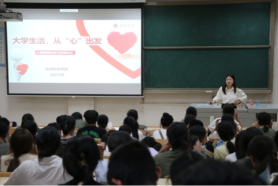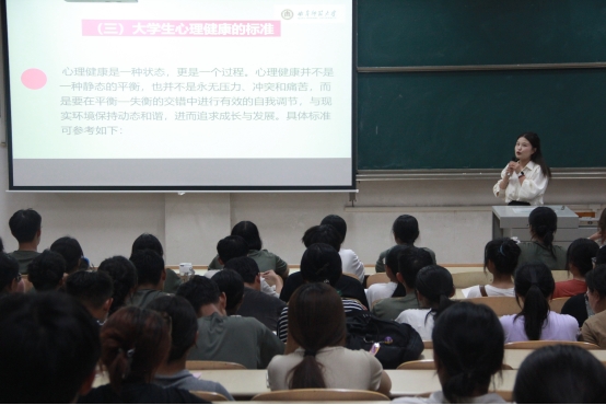 袁晓涵老师分别从正确认识心理健康、大学新生常见的适应问题、如何应对大学新生适应问题等方面展开论述,循序渐进地讲解心理健康知识,深化了新生对于心理健康的认知。通过将心理健康理论知识融入具体案例,进一步引导同学们如何在遇到困难时进行自我调整。她强调要正确看待心理健康问题,遇到困惑时要及时与辅导员沟通,寻求专业心理咨询的帮助,并在讲座的最后为同学们详细介绍了学校心理健康教育与咨询中心的预约方式。