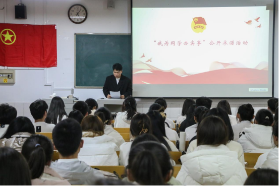 会议伊始,主持人再次重申了“我为同学办实事”的活动目的,即聚焦同学们的学习和发展需求,帮助同学解决实际问题,增强广大同学的获得感和幸福感,进一步增强学生干部的服务意识,切实提高团学工作服务水平。首先,学生会主席王良凯带领全体参会学生干部进行了公开承诺活动。随后,团委副书记,主席团成员、团委及学生各部门部长在《“我为同学办实事”公开承诺书》上郑重签下了自己的名字。