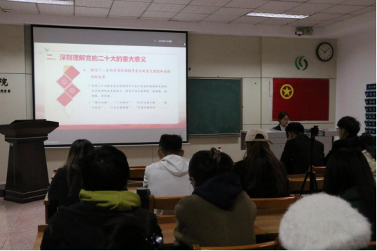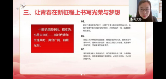 课程伊始,刘文静概述了本次培训要进一步加强青年学生骨干对党的二十大精神的深入理解,强化思想引领,以“让青春在新征程上书写光荣与梦想”为主题,从深刻理解大会主题、深刻理解党的二十大的重大意义、为什么重视青年工作这三个方面着手,带领同学们学习了党的二十大精神。她强调,当代青年人生奋斗的黄金期与全面建设社会主义现代化国家的宏伟征程高度契合,生逢伟大时代、肩负强国使命,广大青年应主动接过历史的接力棒,争做有理想、敢担当、能吃苦、肯奋斗的新时代好青年,用青春的能动力和创造力砥砺成长,用青年的智慧和汗水为国家的繁荣做出贡献。学员们紧跟老师思路并认真聆听记录,收获颇多。