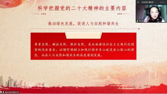 宣讲结束后,刘文静进行了培训总结和下一步学习部署。她强调,学习宣传贯彻党的二十大精神是当前和今后一个时期全党全国的首要政治任务。广大团员青年、全体同学要继续认真学习贯彻党的二十大精神,牢记党的嘱托,树立投身国家重大战略和到祖国最需要的地方建功立业的职业观、事业观,努力成为有理想、敢担当、能吃苦、肯奋斗的新时代好青年,为全面建设社会主义现代化国家、全面推进中华民族伟大复兴,作出新的更大贡献。