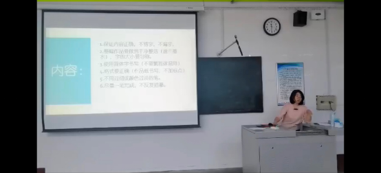 张兢兢老师主要从文字鉴赏和书写技能两个方面进行讲解,并对照学生之前的练习作品,指出了常见的问题。她强调,规范书写不仅是字迹变得好看,还要在坐姿上力图端正,在握笔上注意分寸,这样才能算是规范地书写。最后,张老师与同学们分享了在书写作品时应有的心境并向在座同学表达了真挚的祝福。此次培训切实提高了学生日常书写技能,激发了学生对于书法艺术的热爱,鼓励学生在接下来的师范生规范书写大赛中能够调整到最好的状态。