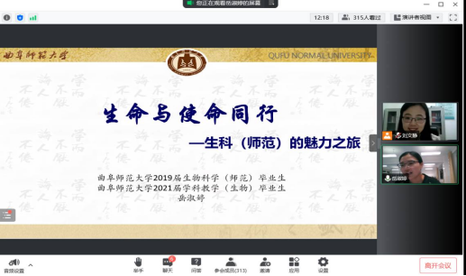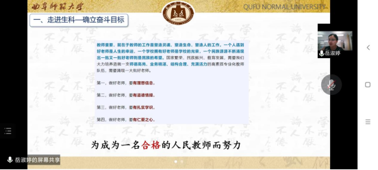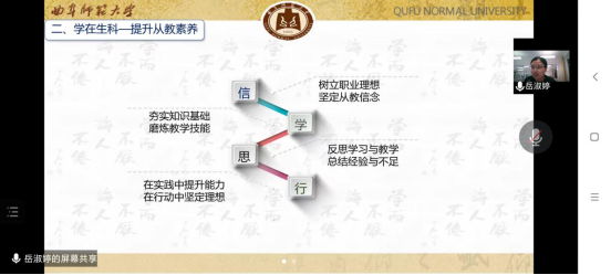 2019届优秀毕业生岳淑婷作为题《生命与使命同行》线上讲座。会议伊始,岳淑婷与2022级新生们讨论了一名合格的人民教师应具备的从业素养。她认为,师范生首先应该树立职业理想,坚定从教信念,注重在实践中磨炼教学技能,在行动中坚定理想。想要成长为一名优秀的人民教师,需要不断的学习,完成不同阶段的转型。