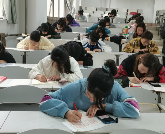 于综合楼201教室举办第四届“杏坛杯”三笔字大赛,本次活动面向2019级和2020级全体学生,2019级辅导员赵连栋老师,2020级辅导员袁晓涵老师担任评委老师。