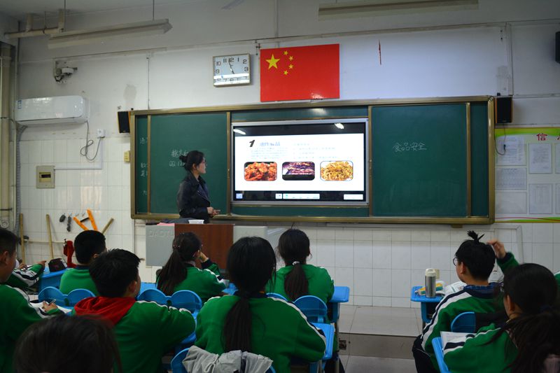 同学们共分成12个小组,分别对初一、初二年级的12个班开展活动。他们从以下六个方面进行介绍:第一、介绍十大垃圾食品,包括它们的分类以及主要危害;第二、简单回顾今年3.15曝光的“毒辣条”和“土鸡蛋”事件;第三、从我们日常接触的一些小食品的生产环境、生产原料等讲述小食品的不安全性;第四、讲解什么是食品添加剂与怎么辨别添加有食品添加剂的食品;第五、讲解如何在购买商品时从食品商品包装袋上获取商品的主要信息以及我们应重点关注的几点内容;第六、简单介绍我们日常所需的主要营养物质以及它们的作用和可获得的途径。他们利用准备好的PPT及相关视频,与同学们进行互动交流,用近年来曝光的相关食品安全的案例来使同学们进一步意识到辨别食品好坏的重要性。
