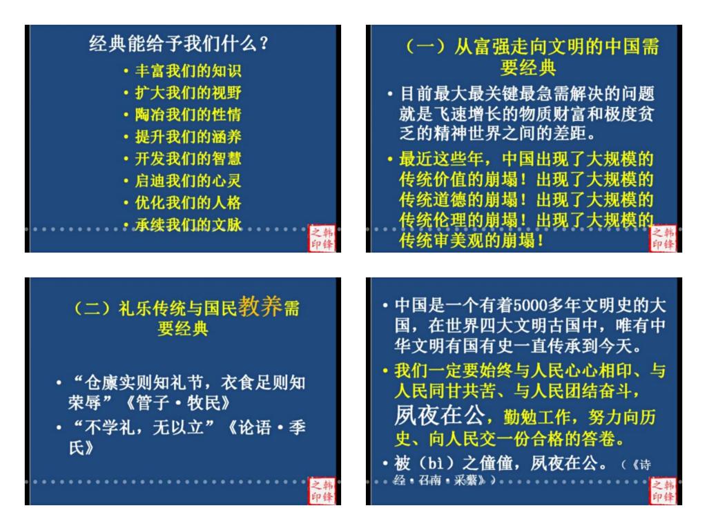 青马培训第四讲,由韩锋老师做主题为《经典能给予我们什么——从习近平总书记讲话历引经典说起》的讲座。韩老师从一篇名为《将传统文化当做独特战略资源》文章讲起,介绍了甲骨文等古文字的经典内涵、文字的来源和创造以及中华文化五千多年的历史。然后,韩老师阐释了社会主义核心价值观,围绕大学之道深入解释了立德树人、修身为正的重大意义,并强调从经典中汲取时代价值的重要性。最后,韩老师以一篇名为《我们为什么要读经典》文章结束,总结了经典带给我们的启示。