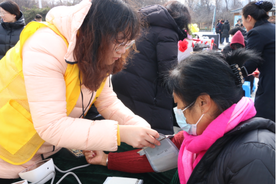 活动当天,曲阜市沂河公园广场人头攒动,气氛热烈。志愿者服务队的同学们早早来到现场,搭建服务台、准备仪器设备,为市民提供义务量血压服务。志愿者们身着统一服装,面带微笑,耐心细致地为每一位前来咨询的市民测量血压,并根据测量结果给出健康建议。
