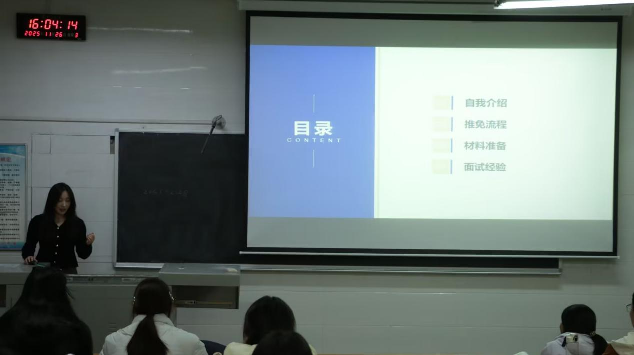 分享环节中,三位同学各有侧重,倾囊相授。马慧娴聚焦竞赛赋能,详细拆解了各类核心竞赛的选题方向、备赛流程与团队协作技巧,鼓励同学们以竞赛为契机突破舒适区,在实战中锤炼专业能力与创新思维。潘怡然则从长期规划视角出发,分享了高效学习方法、GPA提升策略,更贴心传授了保研备战期间的心态调节秘籍,提醒同学们在追逐目标的同时,保持从容与坚韧。侯慧琳结合多所高校的面试经历,直击面试核心环节,从简历亮点提炼、专业问题应答逻辑到临场应变技巧,逐一拆解,并针对保研过程中易踩的“时间规划误区”“材料准备漏洞”等常见问题给出避坑指南。
