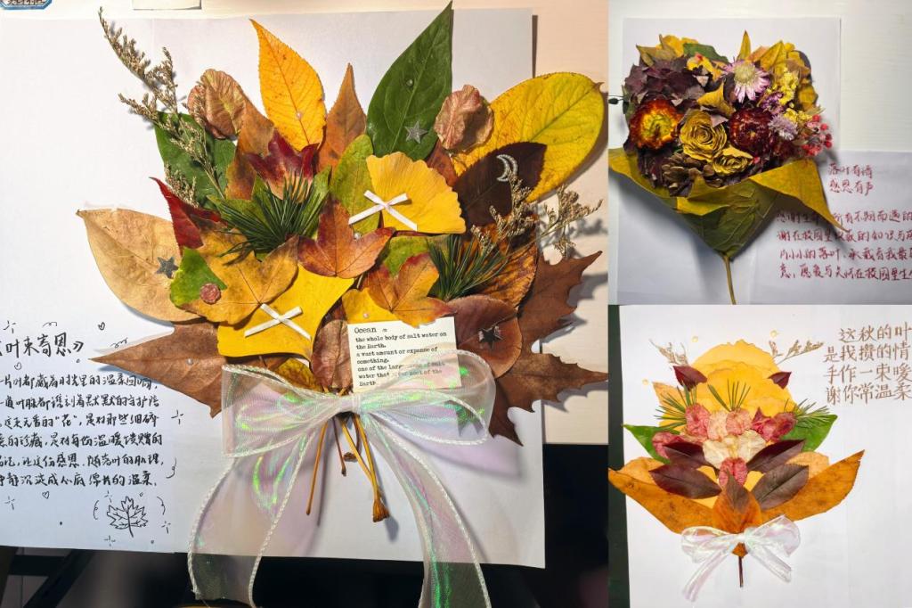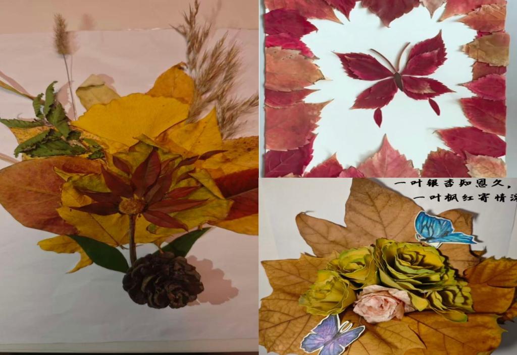 活动分为落叶收集、创意拼贴与作品阐释三个环节。同学们利用校园秋叶,搭配简易工具,围绕“感恩”主题进行自由创作。作品形式多样、构思巧妙:有的以暖色调叶片层叠出温馨的花束意象,表达对身边人的真挚谢意;有的通过红棕交错传递深沉情感;更有同学以枫叶与银杏叶拼贴出雷锋形象,赋予传统精神以生动的艺术呈现。这些作品不仅展现了同学们的审美素养与创作能力,更反映出他们在情感表达与价值认同上的用心与成长。