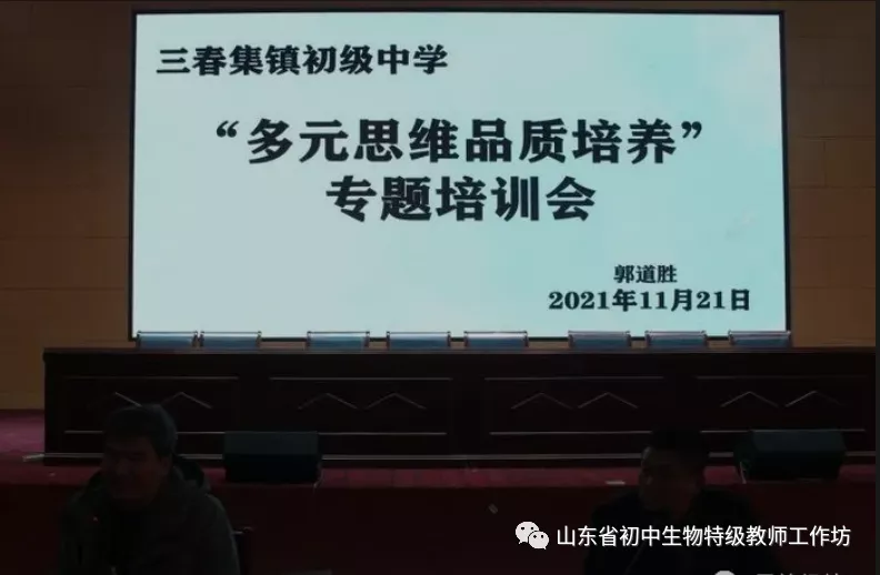 新教育时代的发展对初中生物教师提出了更高的教育要求,基于核心素养的课程教学改革正在逐步深入,而核心素养的核心是思维。因此,在课堂教学中落实思维方法和培养思维能力是当下提升课程教学质量的重要路径。2021年11月21日,山东省初中生物特级教师工作坊济南章丘区特级教师郭道胜教授来到菏泽市东明县的三春集中学为全体教师进行了“多元思维品质培养”的专题培训。