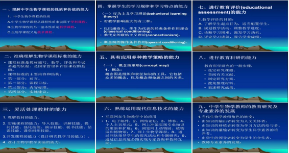 结合社会发展对教师的需求,王运贵提出了教师应当具备9个方面的基本功:理解中学生物学课程的性质和价值的能力、准确理解生物课程标准的能力、灵活处理教材的能力、具有应用多种教学策略的能力、熟练运用现代信息技术的能力、进行教育评价的能力、进行教育科研的能力、中学生物学教师的教育研究及专业素养的发展。并指出当代教师角色在逐步发生变化,教师应当与时俱进,以合作学习、探究学习、概念图、科学—技术—社会(STS)教学等多种教学策略丰富课堂教学环节,培养学生的生物核心素养,为学生的终身学习与专业发展打下坚实的基础。