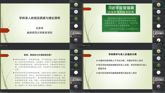 刘亭亭博士结合多年工作经验进行了题为《学科育人的现实困惑与理论澄清》的报告。她立足于自身育人经验以及长期躬耕于教育的实践积累,从学科育人的内涵入手,以“都是班主任津贴惹的祸?”为案例,全面论述了在学科教学中渗透育人思想的现实困难,结合具体案例生动鲜明地指出了现实生活中进行学科育人的难度、强度、可行度,强调了学科中开展思政教育的重要性,并提出了学科育人的有效途径。