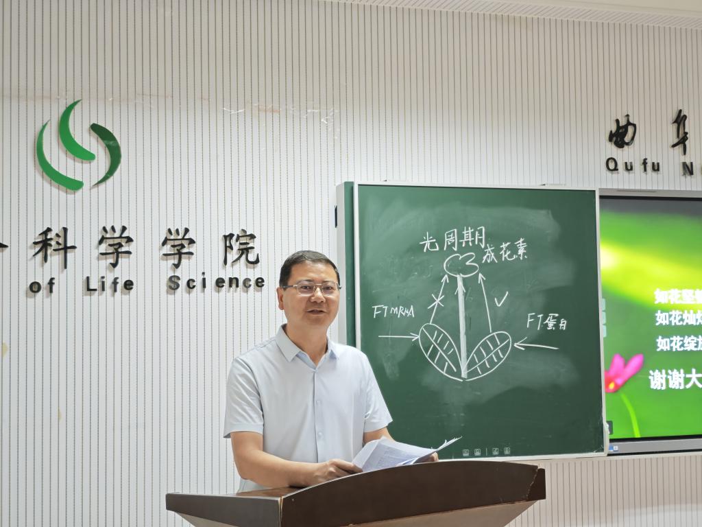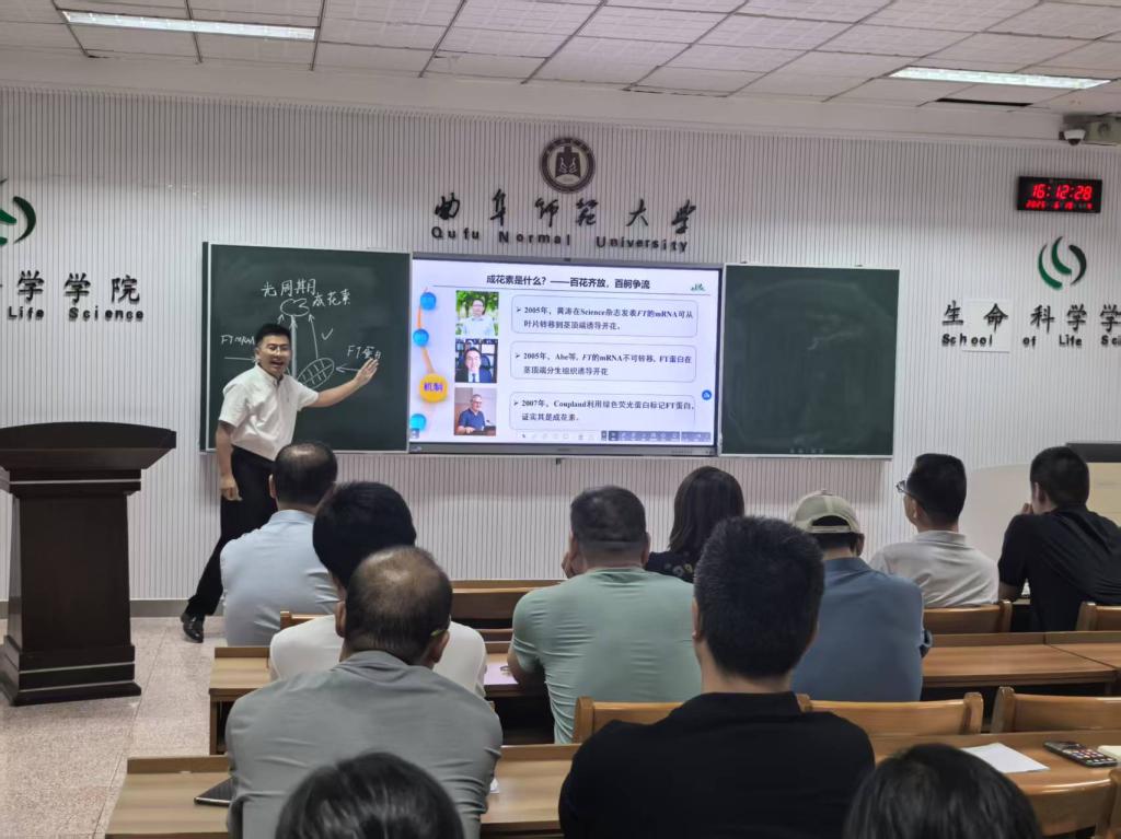 赵航老师“光周期为主题开展课程思政示范课展演。他采用新鲜花朵的实验导入新课提出了“为什么不同的花会不同时期开放”“为什么我们现在可调控花开放的时间”等问题,启发学生思考,激起学生探究欲望。让学生在解决真实情境的问题中展开学习,继而通过“问题串”及合作讨论的学习方式让学生通过自主探究科学史来讲解新知,通过介绍最新科技前沿,进一步剖析光周期调控开花的机制,并通过我国科学家在这一领域的巨大贡献,将家国情怀、科学家精神等思政教育元素巧妙融入教学之中。